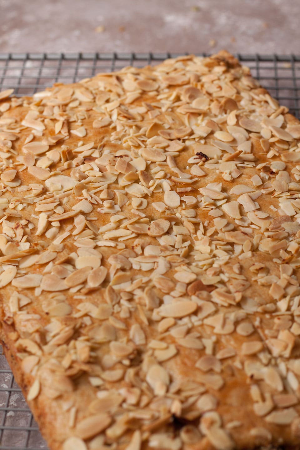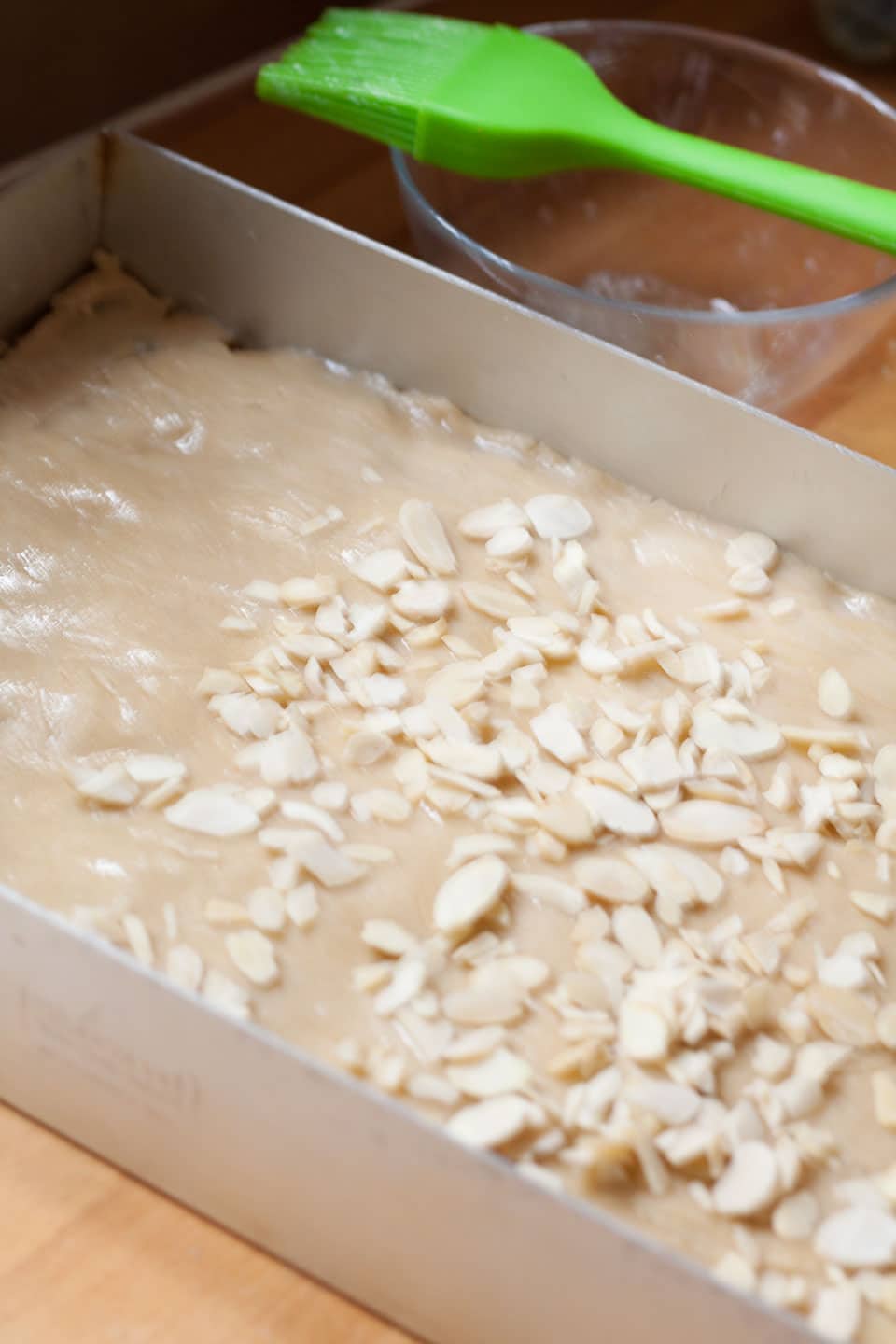 • Brush the top of the pastry with a little egg white, then sprinkle the almonds on top.