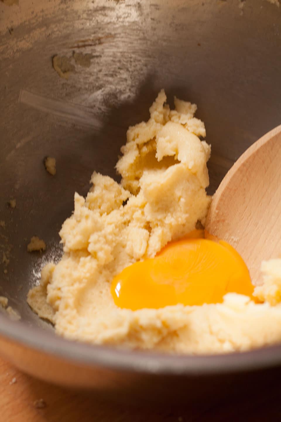 • Place the butter and sugar in a mixing bowl and beat until soft and well combined. Add the egg yolk and almond extract and most of the egg white. Beat to combine.