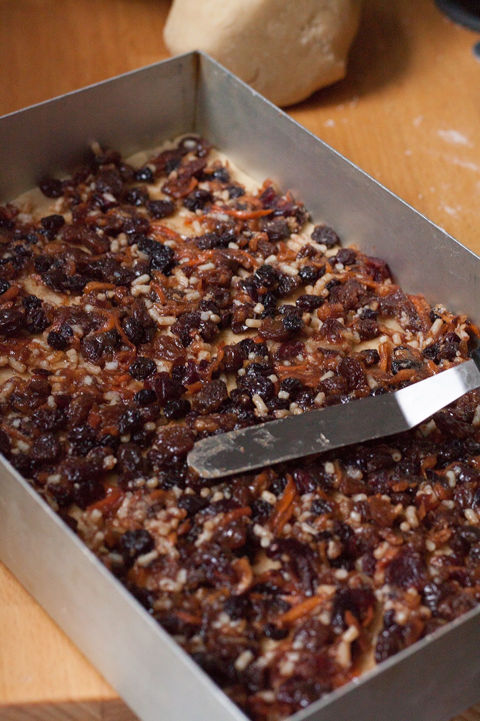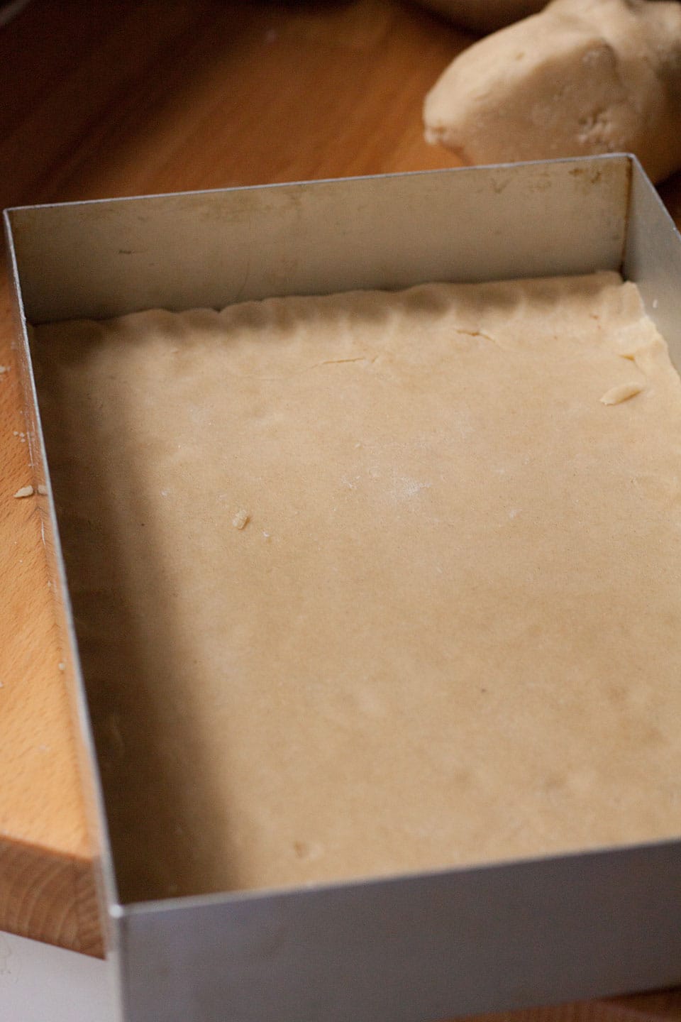 • Divide into two pieces and roll out one half to fit a 20 x 30 cm (8 x 12in) cake tin.