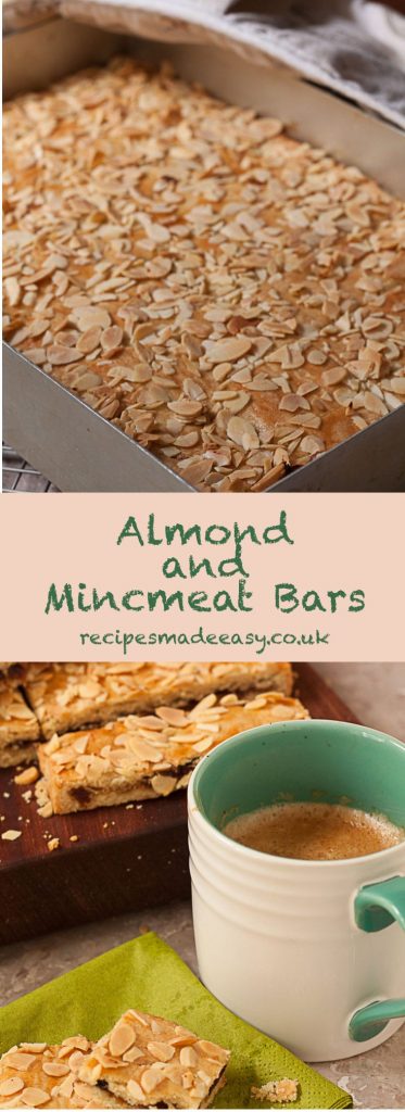 These Almond and Mincemeat Bars consist of two layers of delicious crumbly biscuit sandwiched together with sweet mincemeat and topped with crunchy flaked almonds.