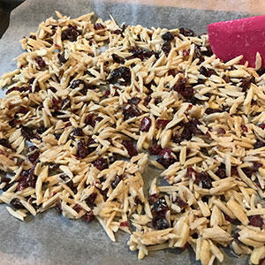 - Place the almonds, cranberries, icing sugar and gin in a bowl and mix well. Spread out on a baking sheet lined with non-stick baking parchment.
