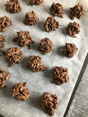 - Stir in the nut mixture. Place spoonfuls of the mixture on to a baking sheet lined with parchment and leave to set.