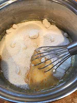 - Add 4 large eggs to the pan and whisk until the eggs are well broken up and mixed with the peel. Whisk in 350g (12oz) sugar and orange juice.