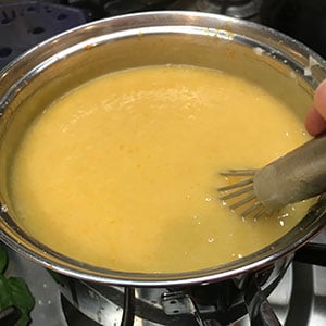 - Place the pan over a low heat and cook gently whisking continuously until the butter melts and the mixture thickens. About 10-12 minutes.