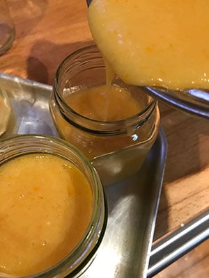 - Remove from the heat and pour into warm sterilised jars. Cover with a waxed disc and seal while hot.