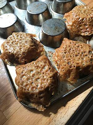 As well as, the traditional shape brandy snap, you can drape them over the back of a muffin tin to shape into a basket, to make a pretty container for a dessert. Alternatively, you can drape them over a rolling pin or just leave them flat. It's really up to you.