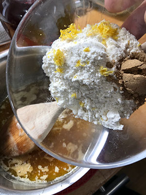 - Sift the flour and ginger into the pan and add the lemon zest and brandy. Mix well to a smooth consistency.