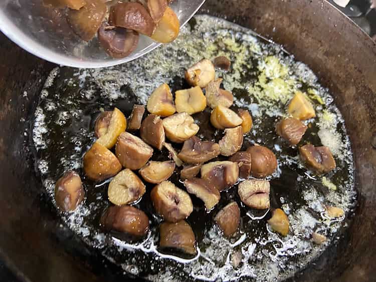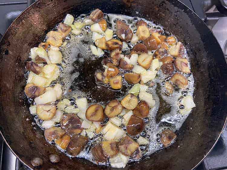 - Meanwhile, melt 25g (1oz) butter with 2 tablespoons olive oil in a large frying pan and tip in 150g (5oz) coarsely chopped chestnut and 1 or 2 chopped shallots and sauté gently until the shallots have softened.