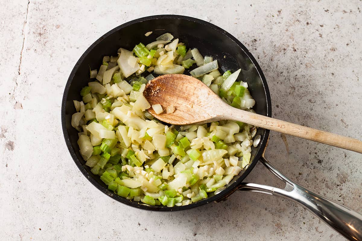 - Melt 15g (½oz) butter with 1 tablespoon oil, in a frying pan. Add one chopped onion and a chopped stick of celery sand sauté for about 5 to 10 minutes until softened and beginning to colour.