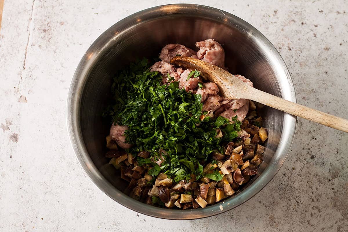 - Add 2 cloves chopped garlic and cook for 1 minute. Tip into a bowl and allow to cool. Add 250g (9oz) each of chopped chestnuts and sausagemeat, plus about 6 tablespoons of chopped parsley and mix well.