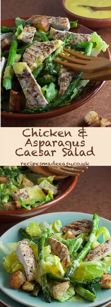 To pimp the salad a little more, I have added chargrilled asparagus stems to mine which, like the chicken, these can also be cooked on the barbecue. The combination of tender chicken breasts, chargrilled asparagus, crunchy romaine salad leaves, and croutons is divine.