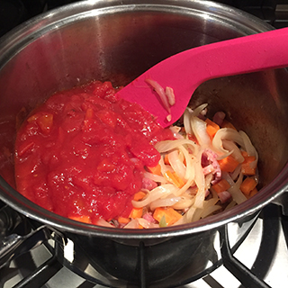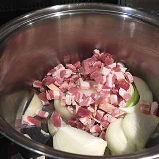 - Place the bacon and onions in a large saucepan and dry fry until the onion is softened and the bacon is browned, about 5 minutes. Start over a low heat until the fat from the bacon begins to run then increase the heat slightly.