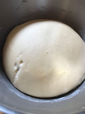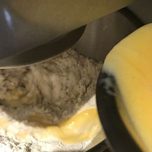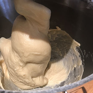 • Beat the eggs in a bowl to break up then beat in the butter mixture. With the mixer on slow, gradually mix into the flour to forms a wet sticky dough. Increase the speed and mix for another 5 minutes until the dough is smooth, shiny and elastic.