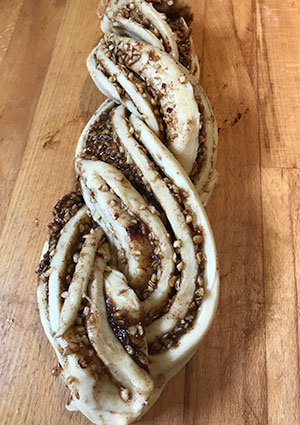 Often made with a chocolate filling, I have chosen to make a cinnamon babka with the addition of nuts.  My first thought was to use pecan nuts sweetened with maple syrup.  A last minute discovery that I had used the last of my pecan nuts means that I decided instead to use some chopped toasted hazelnuts.  These had the added advantage of coming ready chopped! But feel free to try it with diffrenet nuts. As the bread also needs to have a sweet glaze, I thought for ease I would stick with using maple syrup in both the filling and for the glaze.