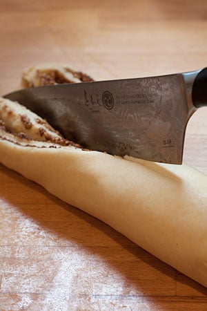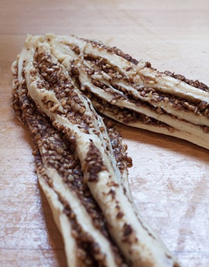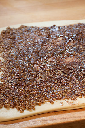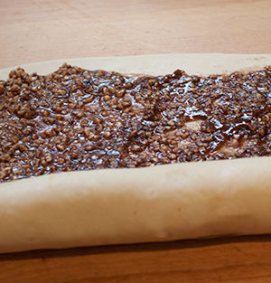 • Lightly grease two, 900g loaf tins. Cut the dough into two pieces and roll one piece into a 30cm square. Spread half the filling over the square and roll up tightly like a Swiss roll. (For more swirls in your loaf roll, continue rolling into a thinner rectangle.)