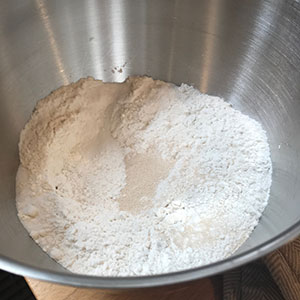 • Place the flours in the bowl of a stand mixer fitted with a dough hook and stir in the salt, sugar and yeast.