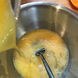 Melt the butter in the milk, add the water, then beat into the eggs.