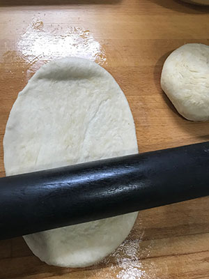 - Divide the dough into two pieces. Lightly oil the work surface to prevent the dough from sticking and roll out one piece into thin rectangle about 35 x 25 cm (14x10 in).