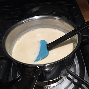 - Pick up the gelatine sheets one at a time and squeeze out the excess water and add to the pan. Stir until the gelatine has completely dissolved.