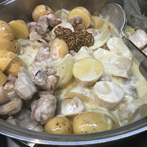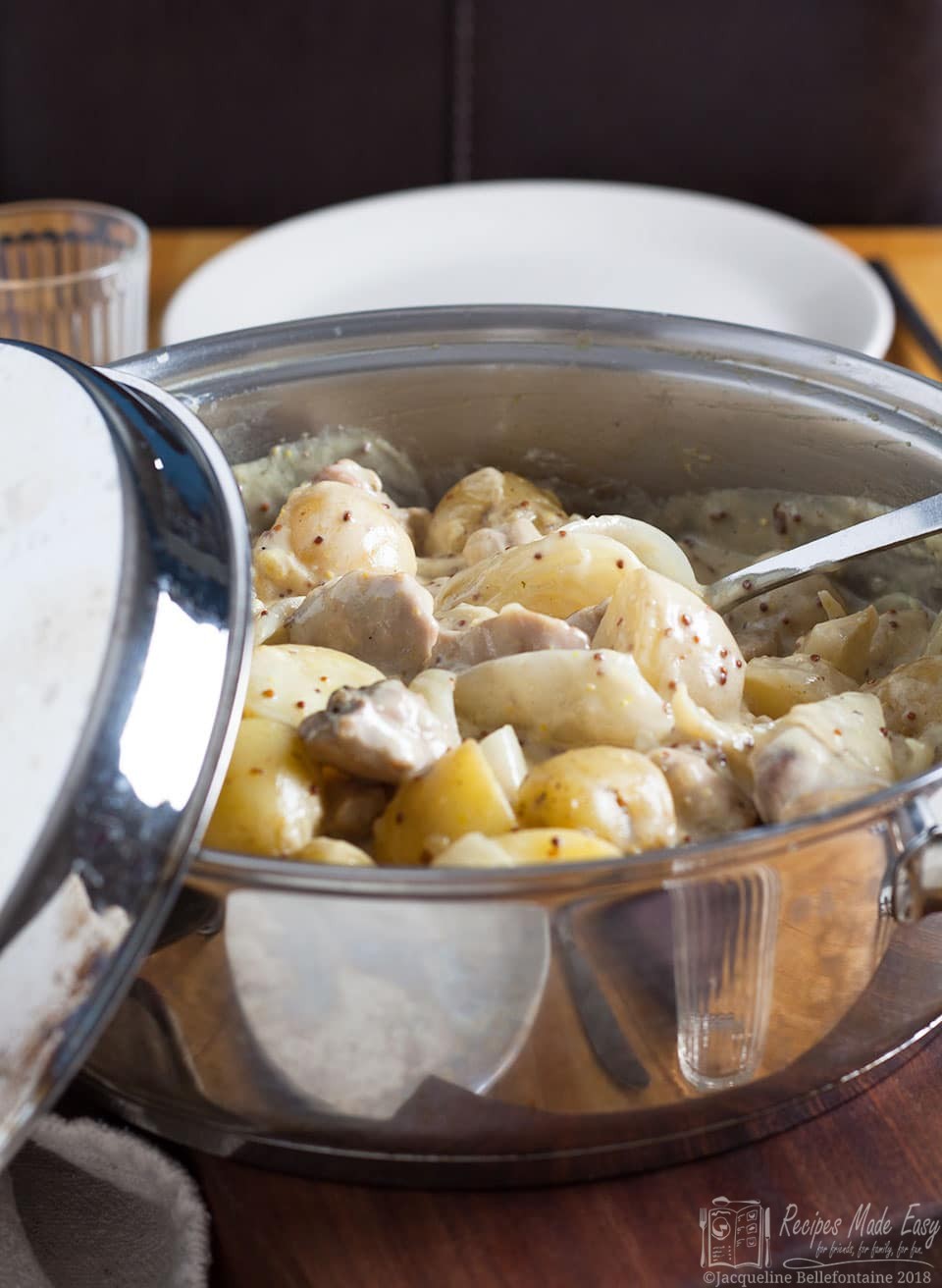 Creamy Mustard Chicken is an easy to make casserole, flavoured with Crème Fraîche and whole grain mustard. The addition of potatoes to the casserole means that all it takes to make a complete main meal is a helping of green vegetables.