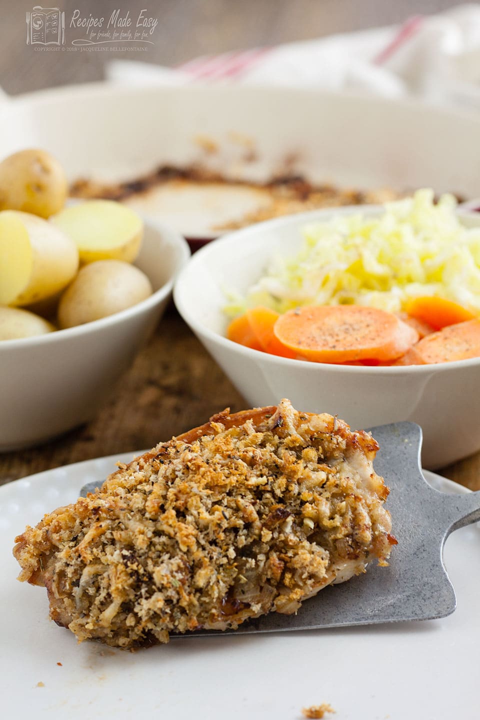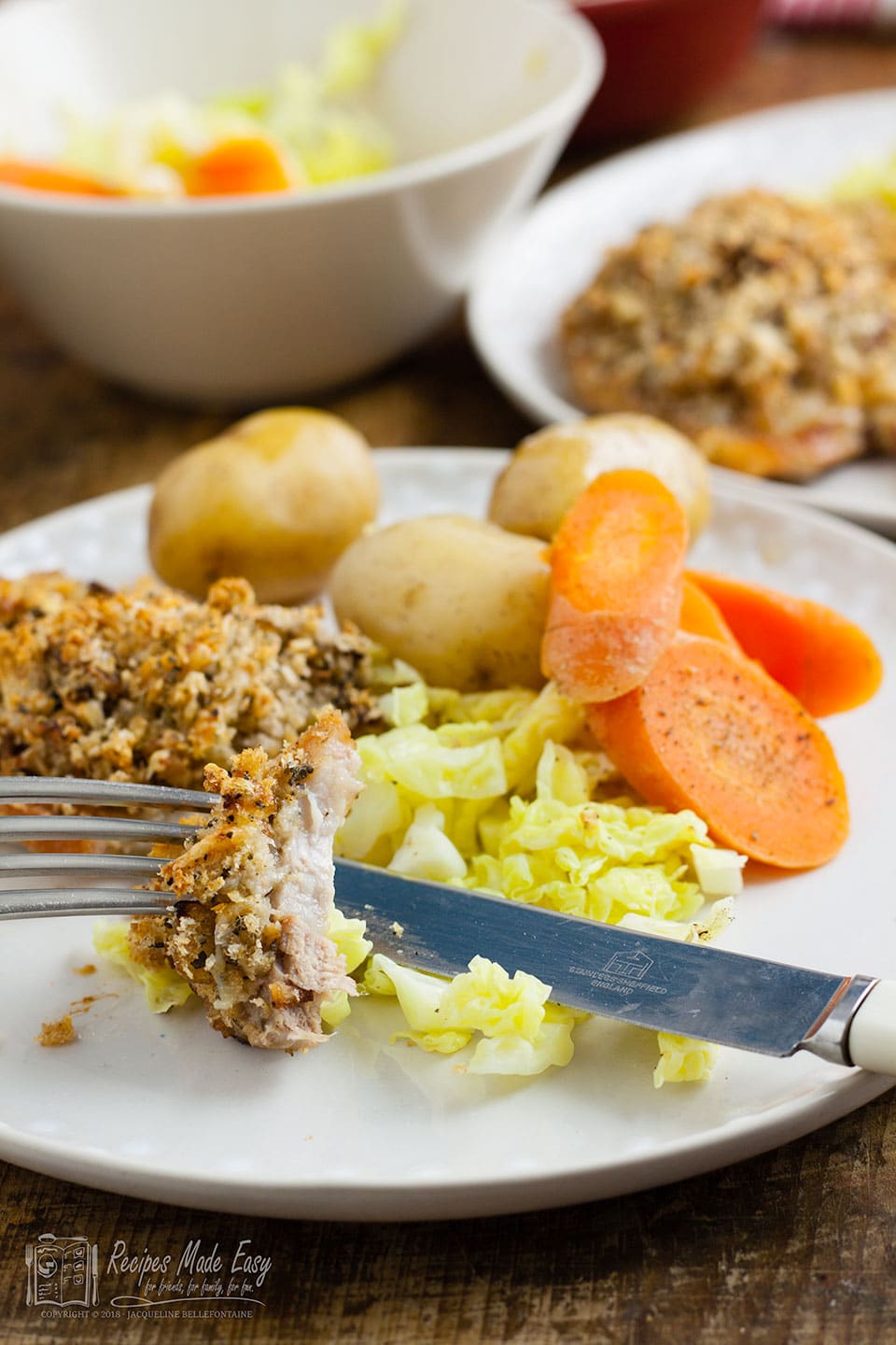 - Bake for 20 minutes until the pork is cooked and crumbs are crisp and golden.