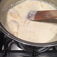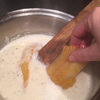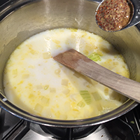 • Add about half of the haddock to the pan with the milk, water and mustard and bring almost to the boil. Reduce the heat and simmer for 10 minutes.