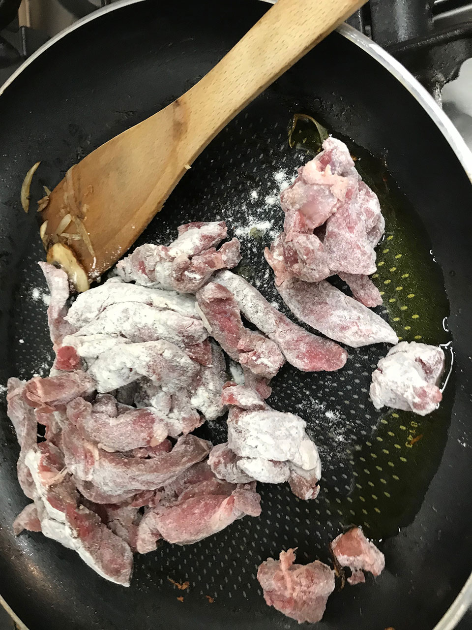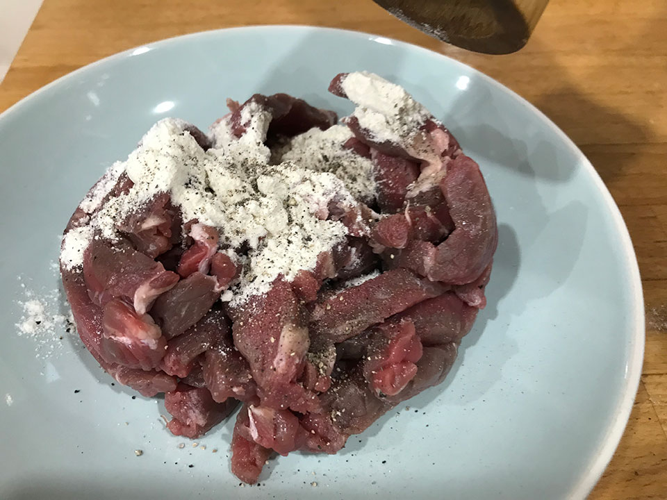 - Remove any excess fat from the beef and cut into thin strips, cutting across the grain. Sprinkle with the flour and season with salt and pepper. Toss together so that the meat is coated with the flour set aside.