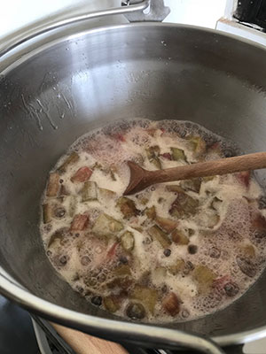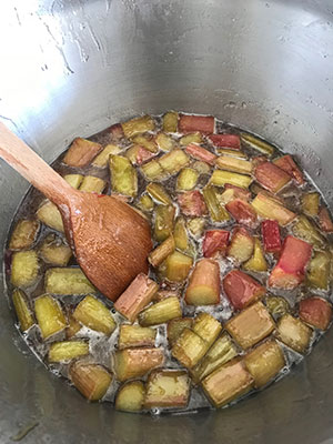 Rhubarb produces plenty of liquid once it starts to cook. To start the juices going, I mixed the rhubarb with the sugar and elderflower cordial which I think adds a nice hint of flavour to the finished jam. Leave it for an hour or so until the juices begin to weep from the rhubarb. This provides just enough liquid to help prevent the sugar from burning on the base of the pan. As the rhubarb cooks more and more juices are released and the sugar will dissolve. Do this over a low heat stirring constantly. You will know when all the sugar has dissolved as it will not feel gritty against the pan anymore as you stir it.