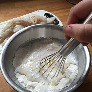 • The batter is really thin and it is tempting to want to add some flour to thicken it, but try to resist! Unlike the thick batter we have when we make fish and chips, this batter should be very light and barely there.