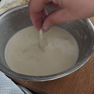 Dip the strips of fish into the batter.