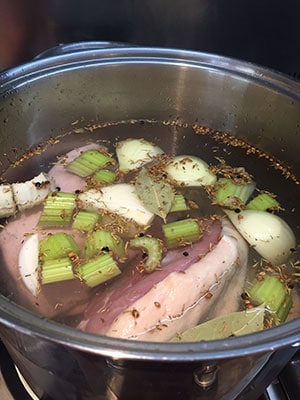 - Remove the two ham hocks from the stock and set aside until cool enough to handle.