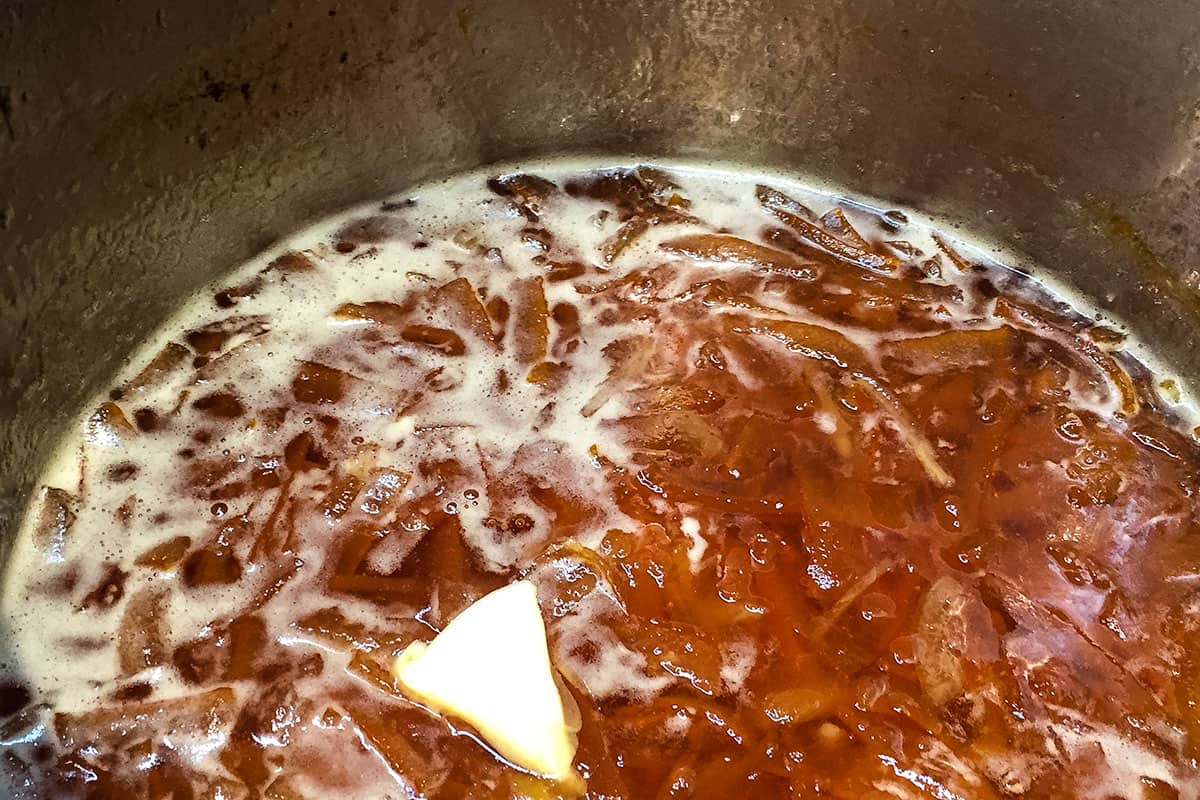 - Remove from the heat, stir in a small knob of butter to disperse any scum. Spoon off any that remains.