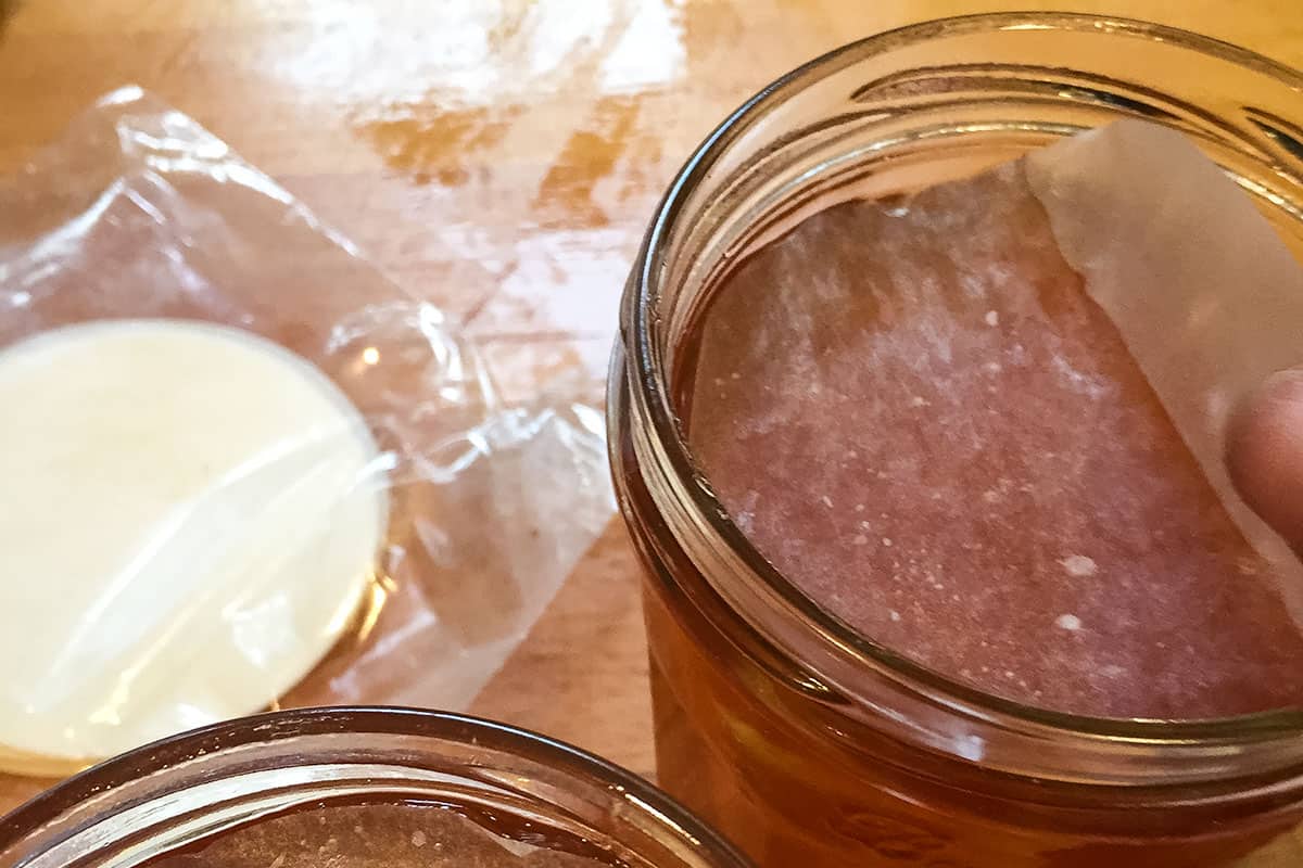 Jars can also be sealed with cellophane secured over the jar with a rubber band. As the preserve cools the cellophane will tighten producing an airtight seal.