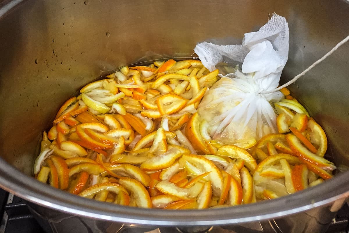 - Bring to the boil, then reduce the heat and cook gently uncovered for 2 hours until the peel is very soft. Remove the heat. Lift out the muslin bag and squeeze as much as you can out of the bag by pressing between two saucers.