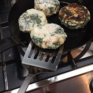 If you are using leftovers, simply miss out the first few steps. The ratio of mash to greens is not critical but aim for more mash than cabbage so that it binds well together. When making it from scratch as in this recipe, allow to cool slightly before adding the egg since it will start to cook and scramble if the mash is too hot. You need to allow it to cool enough to shape anyway, so just be a little patient. If you are in a hurry, you can speed it up a little by tipping into a large cold bowl and spreading it out a bit.