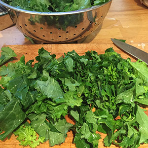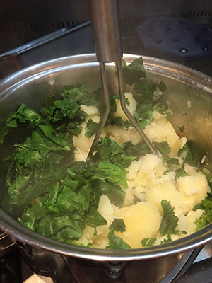 - While the potatoes are cooking, strip the kale leaves from the stems and discard the stems. Wash well then thickly shred. Add to the potatoes for the last 5 minutes of cooking.