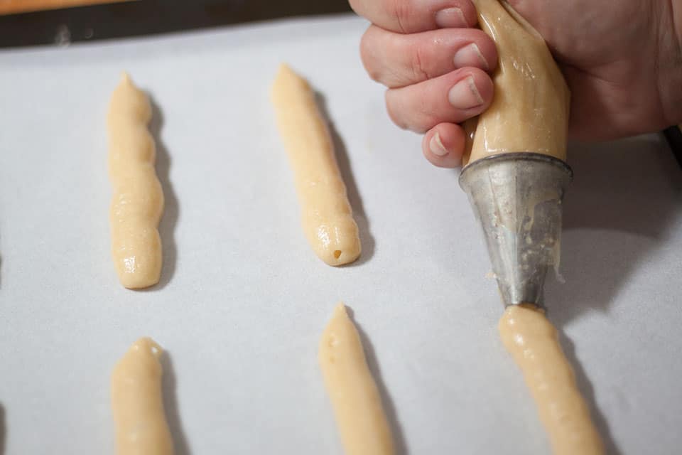 - Spoon the mixture into a piping bag fitted with a 1cm (½in) nozzle and pipe 8cm (3in) lengths onto the baking sheet, allowing space for the mixture to spread.