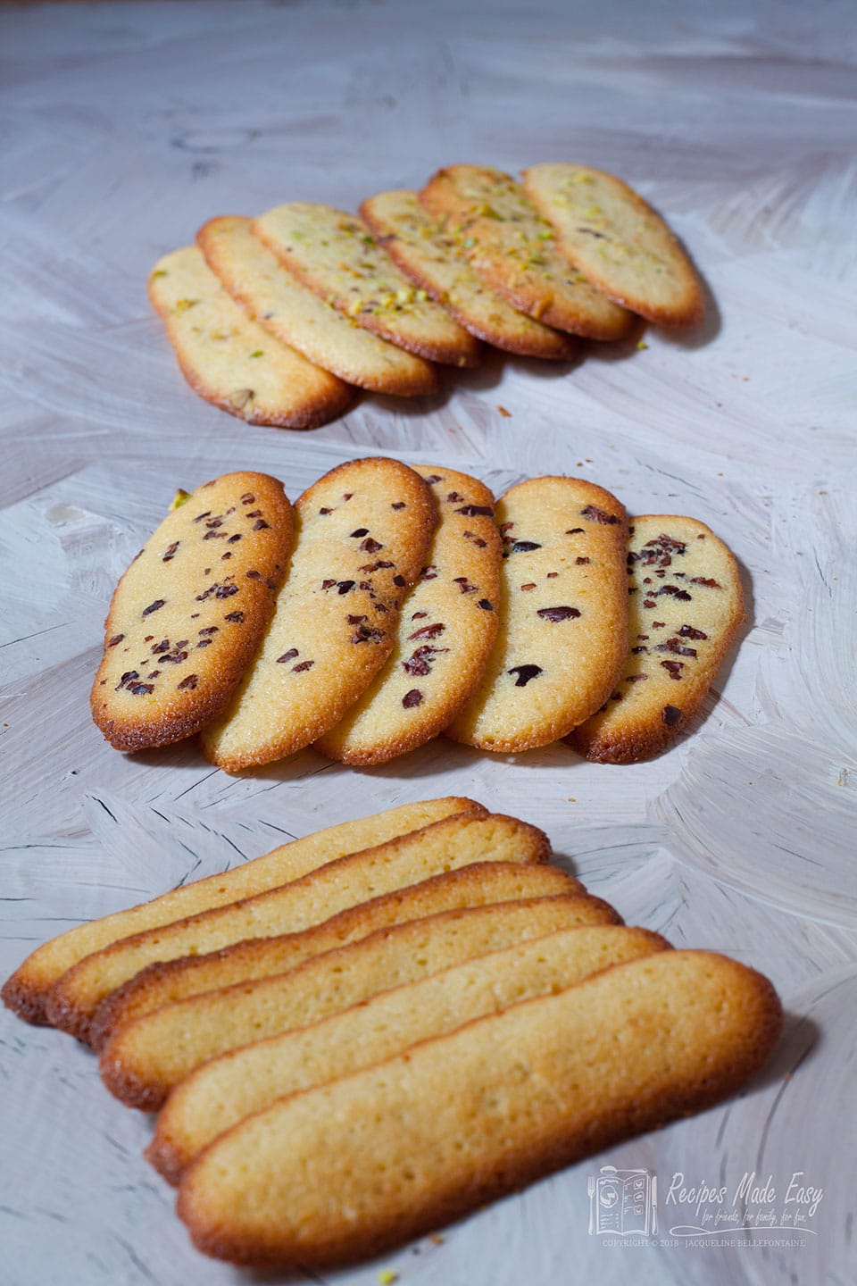 All these variations are much easier than dipping them in chocolate as they did on Bake Off. I've never seen them dipped in chocolate before, and I'm just not convinced you want a chocolate on the biscuit when serving with a creamy dessert. On the other hand, if you are eating them on their own, by all means go ahead but I would suggest plain (dark) chocolate or milk chocolate instead of white chocolate as the biscuits are quite sweet.