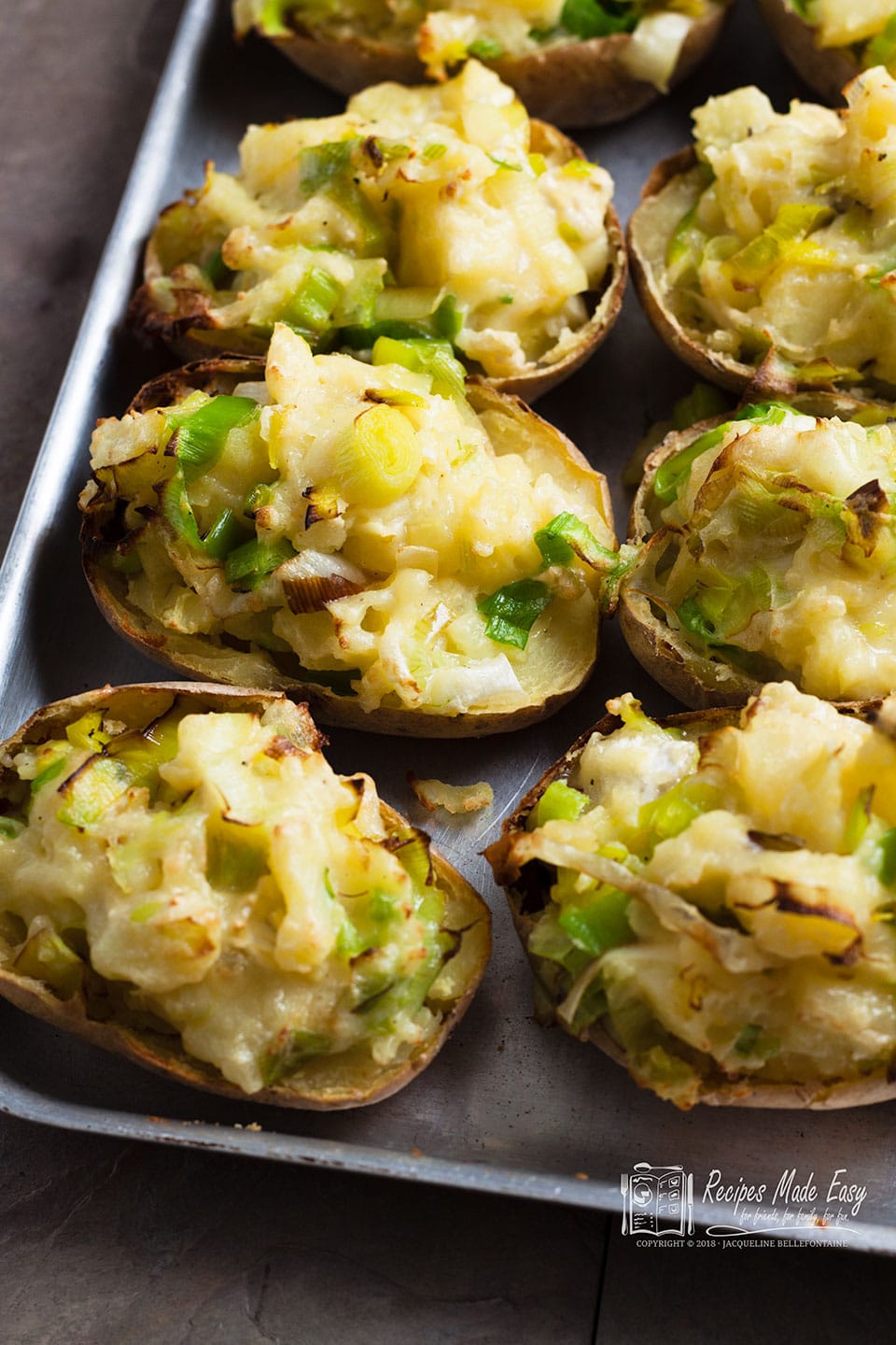 - Add the leeks, season with salt and pepper and mix well. Pile back into the potato skins.