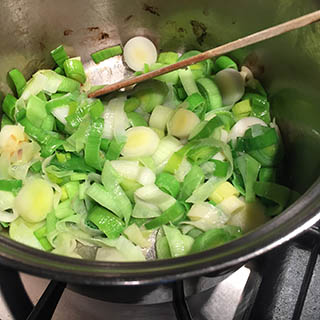 • Melt the butter in a large saucepan and gently sauté the leeks for 4 to 5 minutes until softened.