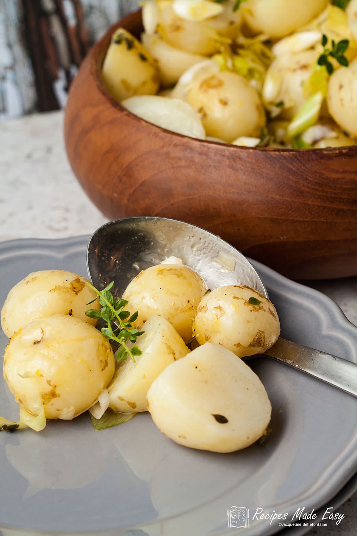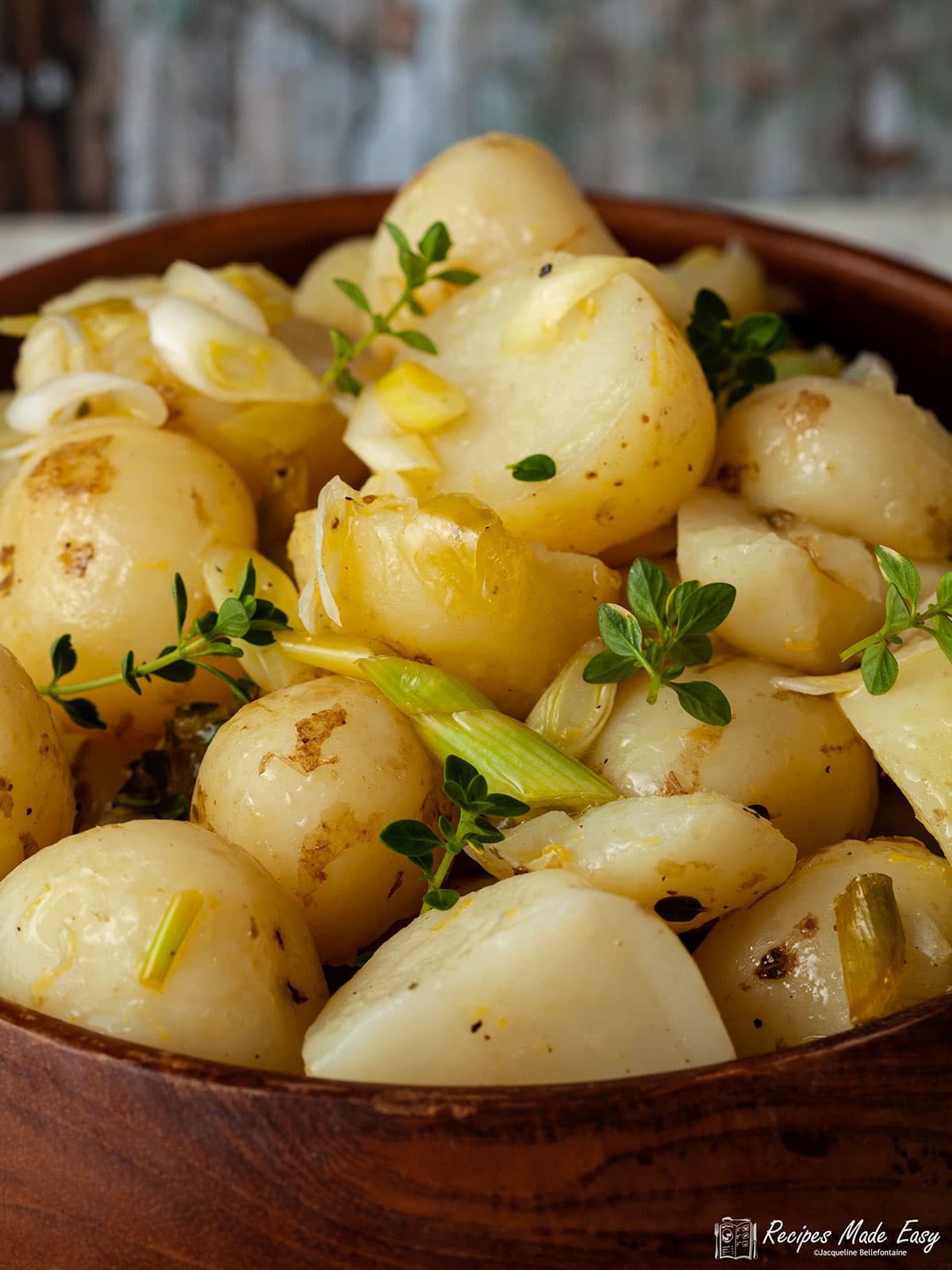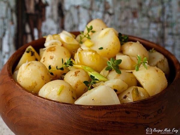 Lighter and fresher than the more usual potato salads made with mayonnaise. The potatoes are infused with a simple lemon and thyme salad dressing.
