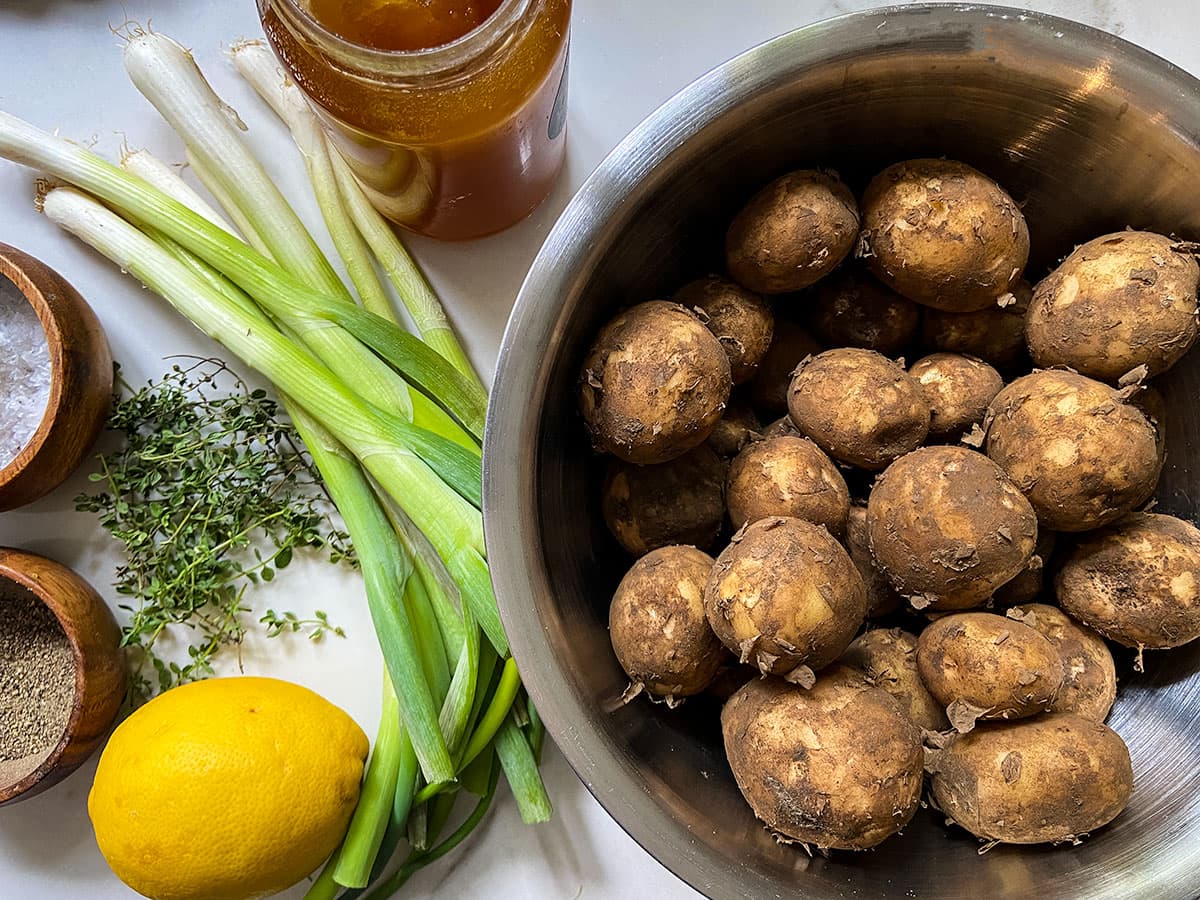 The methods is really simple Scrub or peel the potatoes, and cook until just tender. Then toss with the dressing ingredients.