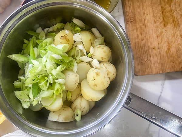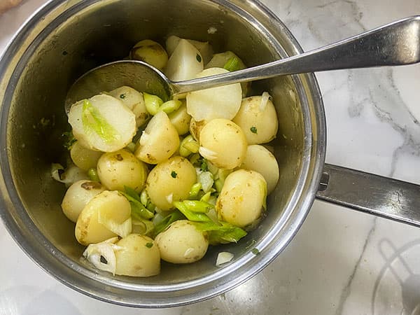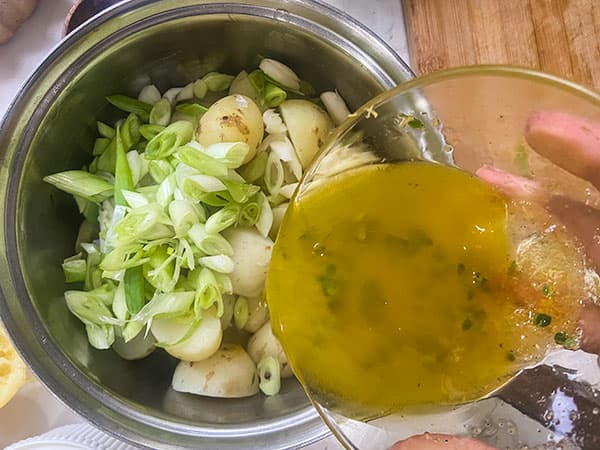 - When the potatoes are just cooked, drain well and return to the pan. Toss in the sliced spring onions and drizzle over the dressing. Toss to combine.