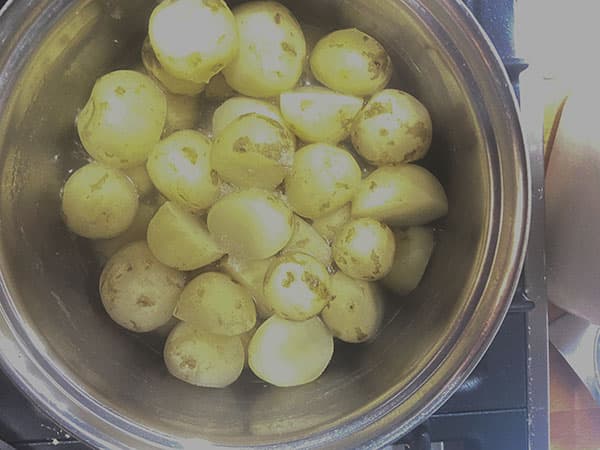 - Peel or scrub 1250g (2½lbs) potatoes and cut any larger one in half so that they are all about the same size. Cook in a pan of lightly salted boiling water for about 15 minutes or until just tender. The potatoes are ready when you do not feel any resistance when you prod them with a skewer.