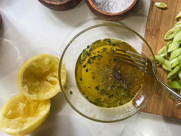 I put all the dressing ingredients in a small bowl and whisk together with a fork but you can also put them in a small jar and give it a shake before pouring over.