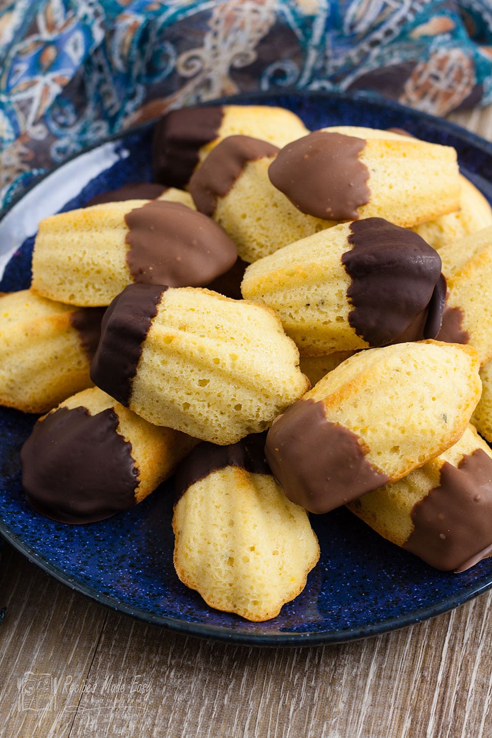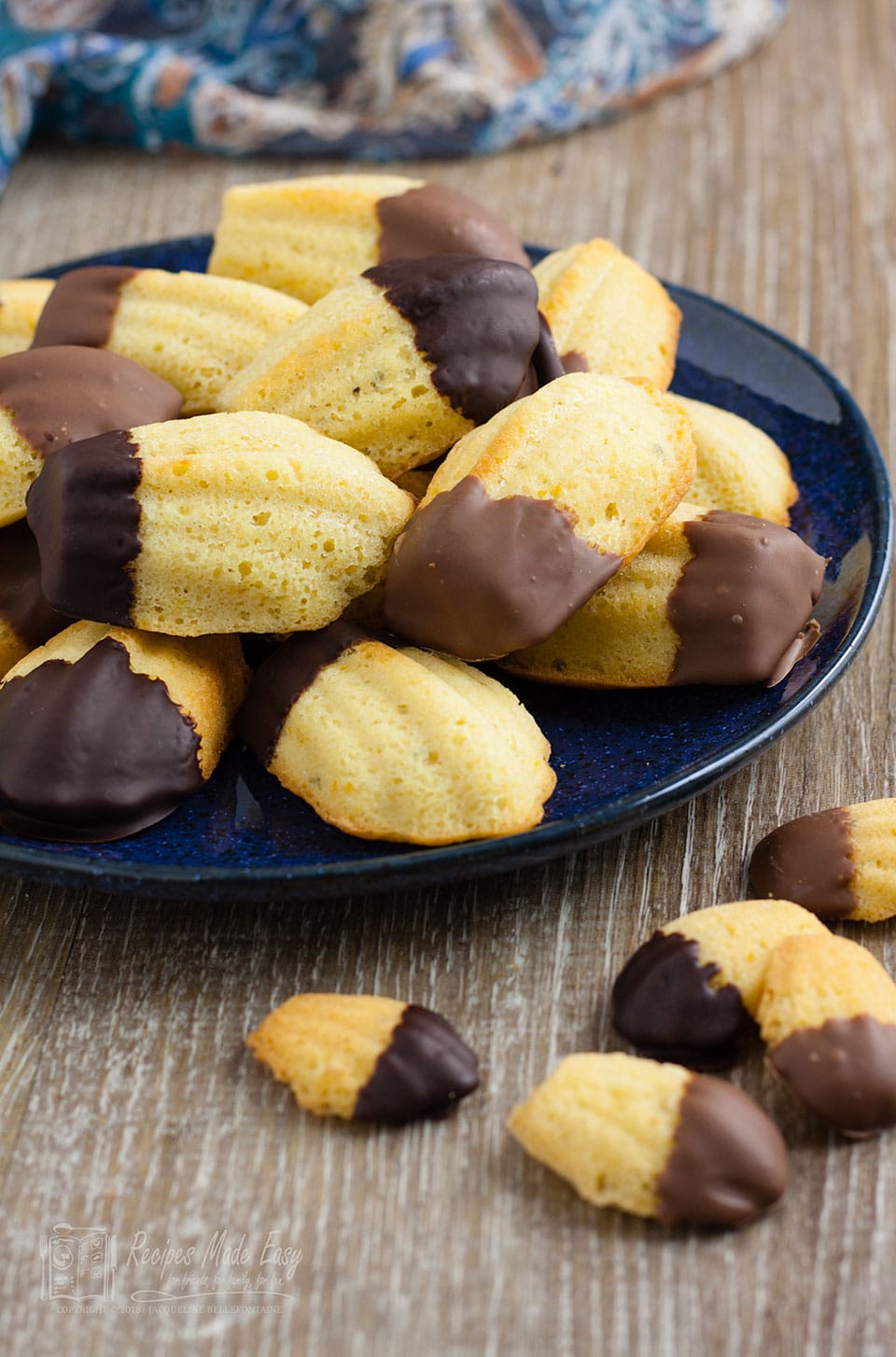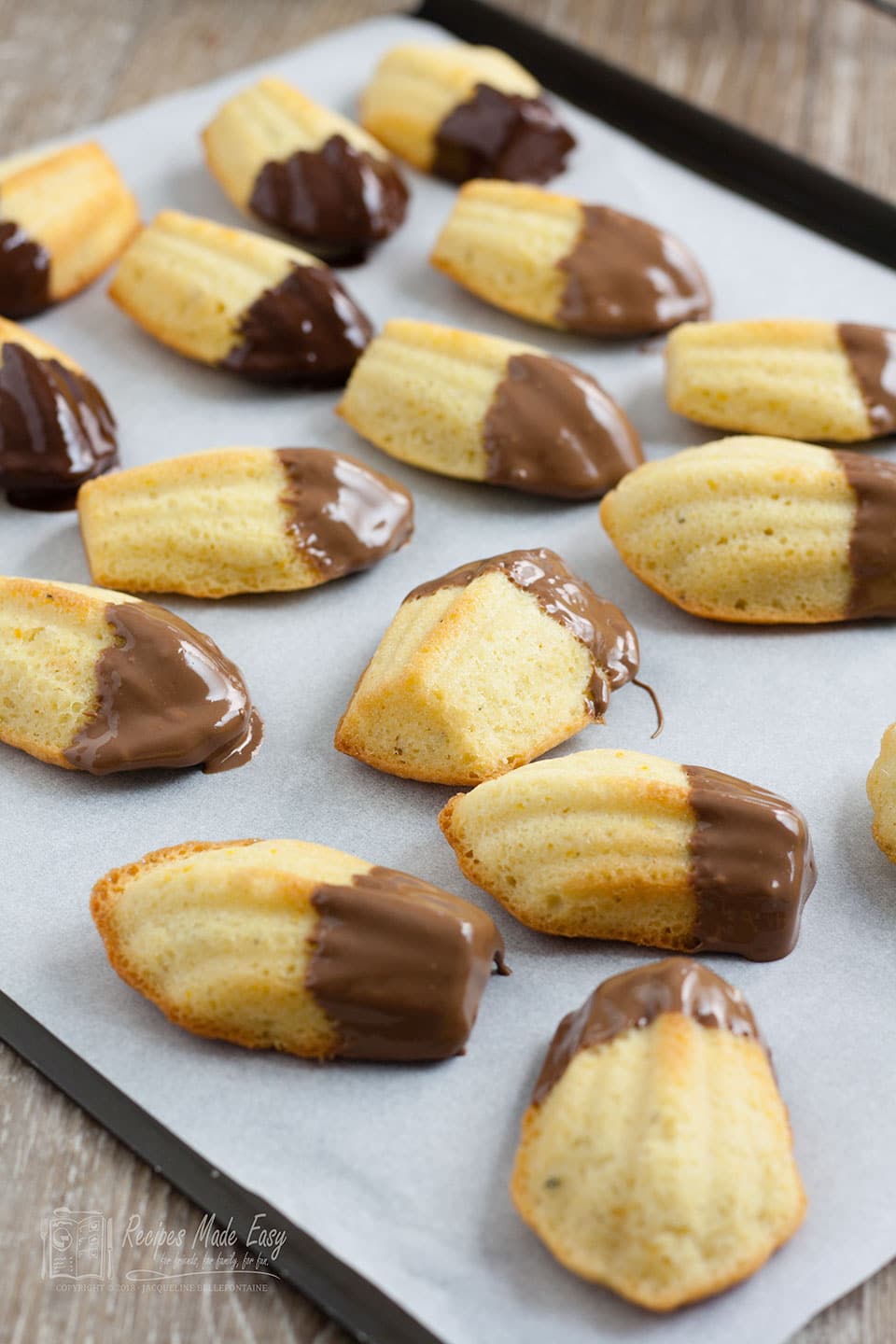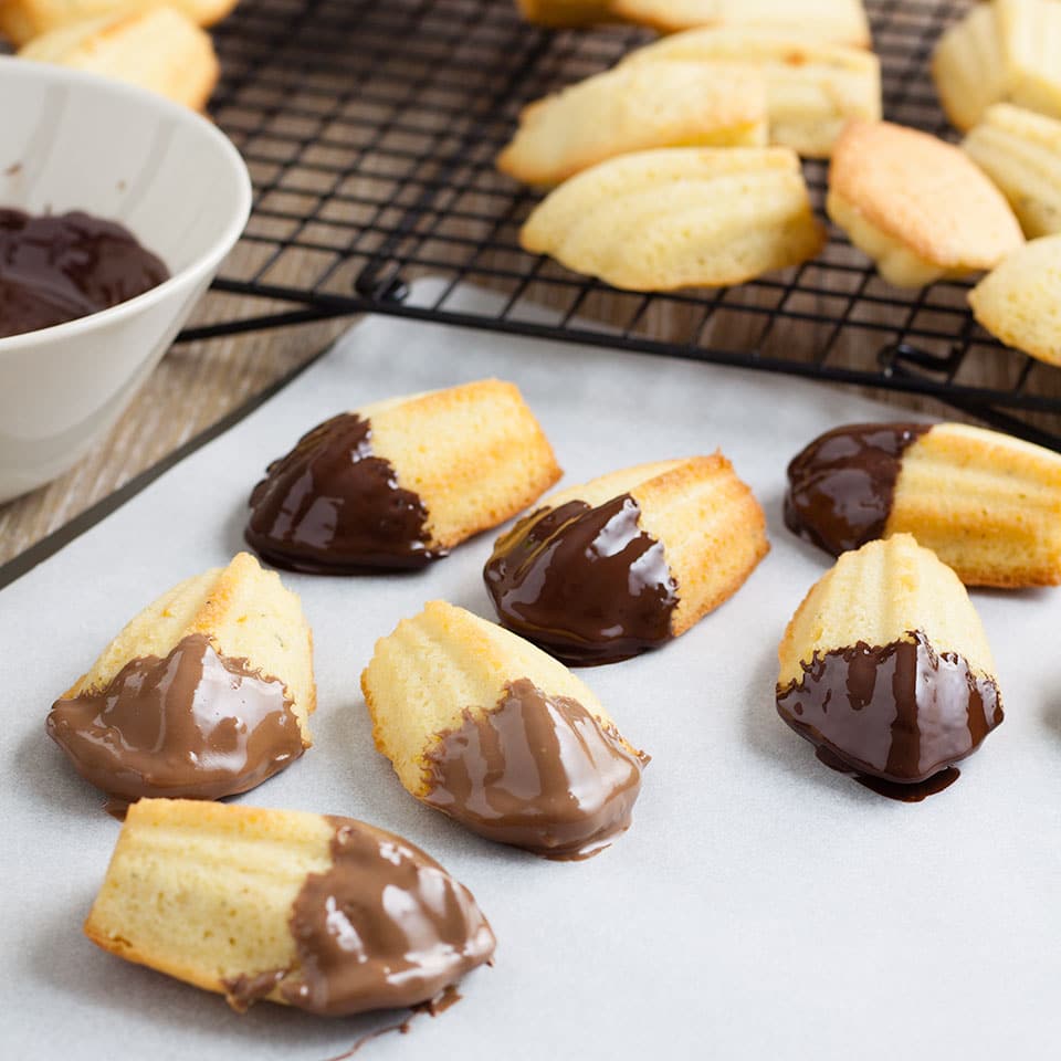 - Heat the chocolate in a small bowl over a pan of hot water stirring until melted. Remove from the heat. Dip one end of the madeleines into the melted chocolate. allow the excess to run back into the bowl then place the madeleine on a baking sheet lined with baking parchment. Leave to set before serving