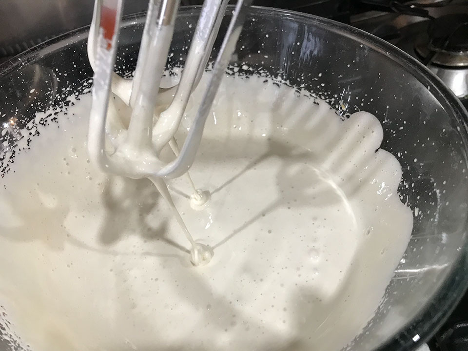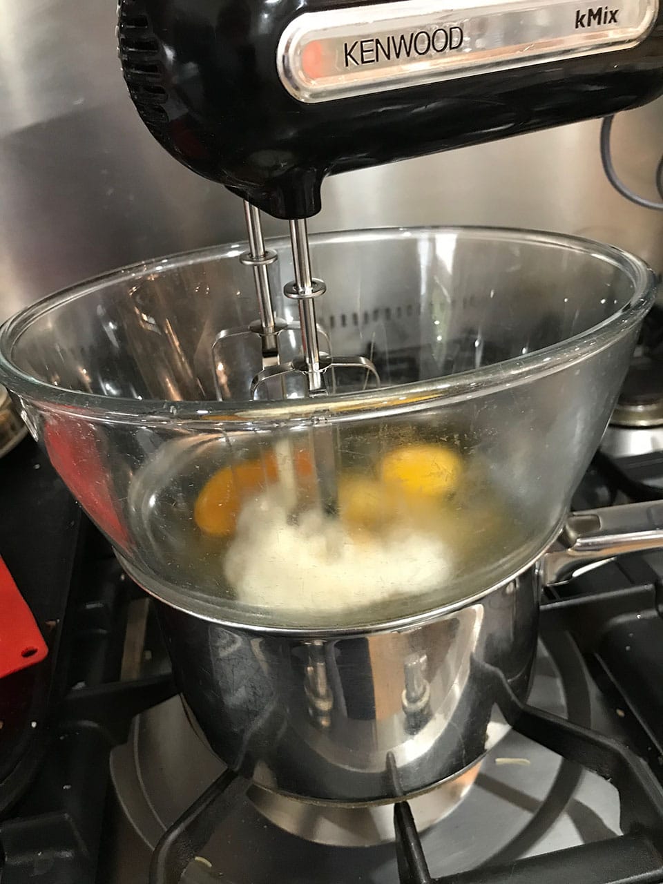 - Place the eggs and caster sugar in a heatproof bowl and place over a pan of gently simmering water. Whisk on high speed until the mixture is very thick and leaves a trail when the beaters are lifted.