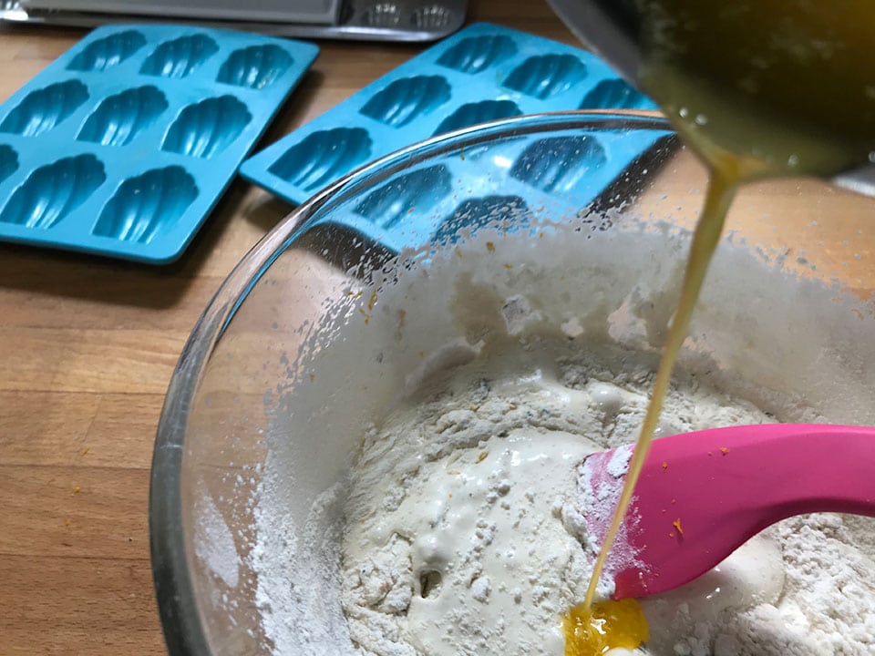 - When the flour is almost blended into the egg mixture. drizzle the melted butter over the top of the mixture and very gently fold in using a figure of eight movement.