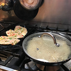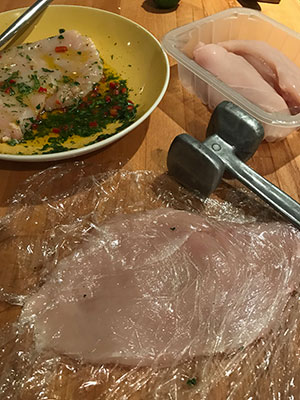 - Place the chicken breasts between two sheets of cling film and beat with the flat side of a meat mallet or rolling pin to flatten slightly. Season well.