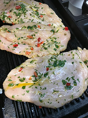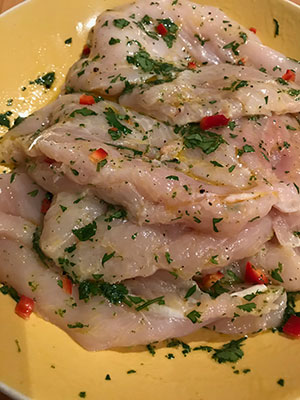 To quicken the cooking time I like to beat the chicken breasts flat so that they cook in just 3-4 minutes each side. This way the chicken doesn't dry out before the centre is cooked through, and they remain lovely and succulent. In addition to the lime and coriander, I have added some chopped chilli to the marinade for extra flavour. I'm a chilli wimp so I used just half a chopped red chilli but you could up the flavour by adding a whole chilli or some of the seeds. An hour marinating is adequate but you can leave it longer if it suits you. So you could put the chicken in the marinade in the morning or even the night before in readiness.